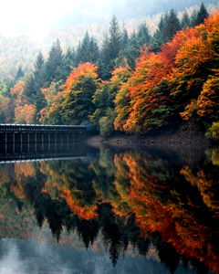 A serene autumn scene, where the bridge casts a tranquil reflection into the calm river. The surrounding landscape is filled with lush trees displaying vibrant fall colors, while misty mountains loom in the background.