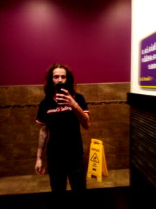 A photo of a bearded individual with dreadlocks, wearing a baseball cap, standing in front of a mirror. He is dressed casually, has visible tattoos on his arms, and appears to be taking a selfie. The background shows a restaurant interior with purple walls and a menu board.