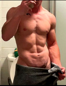 In this steamy image, Onlyfans model Tyler is captured in a moment of self-appreciation. He holds onto his towel, flexing his well-defined abs for the camera. The bathroom setting and mirror reflect his dedication to fitness.