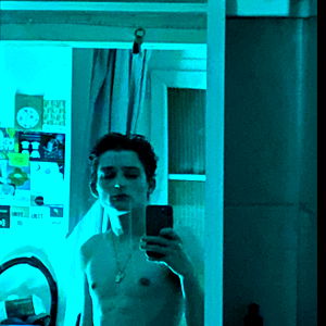 This image captures the intimate moment of French model YourFavoriteTwink taking a mirror selfie. The model, adorned with a blue mask and donned in a black hoodie, is captured in an act of personal expression. The background is blurred, but it appears to be a bathroom setting. The use of the phone for the photo suggests a candid, behind-the-scenes perspective. This image provides a glimpse into the model's daily life and the unique beauty of the French fashion industry.
