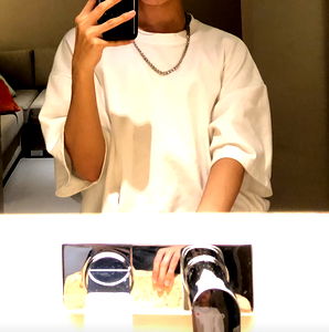 This image showcases a young individual in a relaxed pose, capturing a moment of style. The white sweater adds to the laid-back vibe of the photo. Taken at a hotel room.