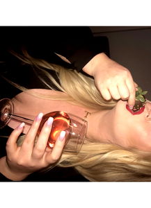 A blonde woman is elegantly posing for a selfie. She's wearing a black leather jacket, holding a wine glass filled with red wine, and enjoying a bite of a small snack. Her long blonde hair stands out against the dark background.