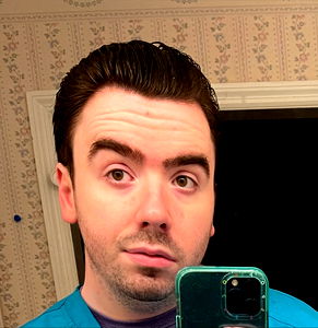 This is a colorful image of Tim, a male nurse from Georgia. He's wearing a scrub top and has a relaxed expression while looking directly at the camera. Tim seems to be taking a selfie, possibly to share his day-to-day life as a healthcare professional.