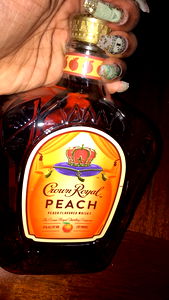 Britoya, an Onlyfans model, is seen in the image holding a bottle of Crown Royal Peach whiskey. She is elegantly dressed and posing for the camera with a confident smile.