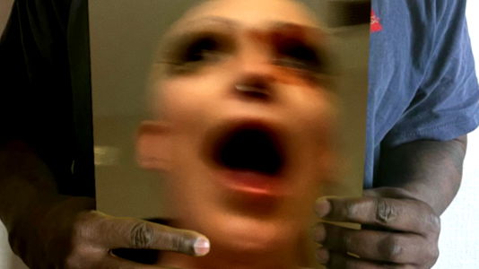 A creative portrait of a model showcasing vivid makeup, including dramatic eyeliner and lipstick, against a mirror. A ring on the finger suggests style or engagement.