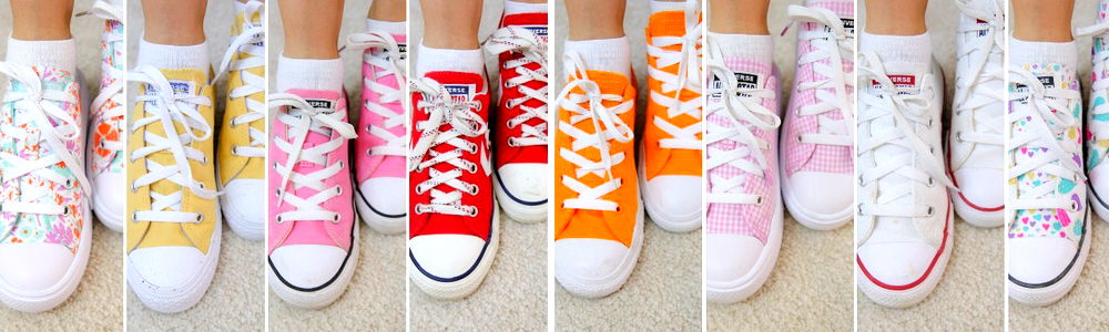 This image features a pair of high-top Converse sneakers in a soft pink color, decorated with a charming heart logo. The shoes are suspended by laces, giving an impression of being displayed in mid-air against a blue background. The combination of classic design and a touch of whimsy makes these shoes a delightful addition to any footwear collection.