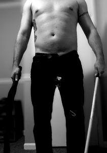 TrophyDom is a muscular man with a tattooed arm. He is posing in a restaurant booth, holding a menu. His attire consists of a black t-shirt with a country music band's logo and camouflage cap. He has a beard and is looking directly at the camera.