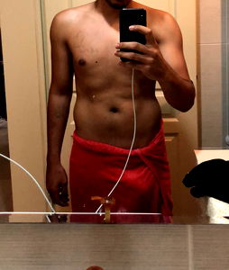 A man with short hair taking a selfie in front of a bathroom sink, showing a well-defined torso and biceps. He is shirtless, revealing visible tattoos on his arms. His skin tone appears to be light. The environment suggests a residential setting with minimal decor.
