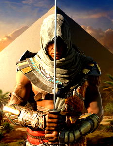 This is an image of a character from the Assassin's Creed franchise, standing in front of an ancient pyramid. The character is clad in Egyptian armor and wields a sword, ready for action. They are poised with determination and strength.
