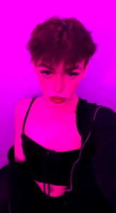 A pink-toned photo captures a young adult with short hair, sporting dark lipstick and a black tank top. They pose against a purple background.