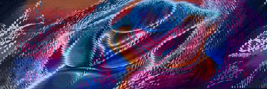 An urban mural showcasing vibrant street art, featuring a character with a thoughtful expression, set against an energetic background of blue and purple hues. The artwork is rich in color and texture, giving it a dynamic, almost three-dimensional feel.