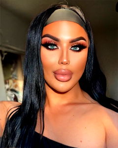 This photo captures a portrait of a young woman, estimated to be around 25 years old. She has a radiant smile that adds a charming glow to her already beautiful face. Her skin is flawless and well taken care of. Her long, black, layered hair falls gently over her shoulders, framing her face perfectly. She has a keen sense of fashion and style, evident in her choice of clothing that is just visible in the picture. The woman's makeup is immaculate, a testament to her expertise in using cosmetics. She has masterfully applied lipstick and lip gloss to her lips, giving them a glossy and attractive look. Her eyes are accentuated with eye liner, eye shadow, and mascara, making them a striking feature on her face. Her eyebrows are well-groomed, matching her hairstyle and overall look. The backdrop of the image is an indoor setting, perhaps a photo shoot. The wall behind her forms a neutral background, ensuring the focus remains on her. This image seems to be a perfect representation of a modern, stylish woman embracing her beauty with confidence.