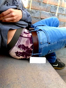 This is a stock photo of an OnlyFans model named Tyler Sagging. He appears to be in casual attire and is captured in a relaxed pose, possibly leaning against a building or bench. The image captures the upper body and lower back area of the model, showcasing a distinctive belt that adds a unique touch to his outfit. His expression seems calm, and the setting suggests an urban environment with brickwork visible in the background. This photograph could be used for various purposes such as fashion advertising, modeling portfolios, or lifestyle imagery.