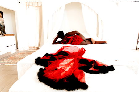 Ty, an OnlyFans model, is seen in a room filled with lush plants. She is elegantly dressed in a red dress with a matching veil, holding up her left arm. Her pose suggests confidence and allure. The room around her adds a touch of green to the scene.