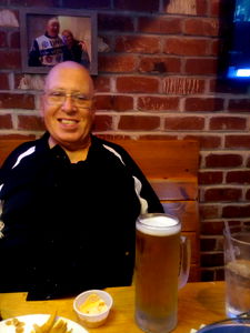 A smiling older man sitting at a dining table with a beer in front of him, posing for the camera.