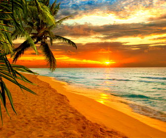 A captivating image of a tropical beach at sunset, with the soft glow of the setting sun illuminating the scene and casting long shadows. The sandy beach stretches out into the horizon, leading towards a palm tree on the right side. A few clouds dot the sky, adding depth to the backdrop. A tranquil sea can be seen in the distance, completing the idyllic scene. Perfect for relaxation and travel imagery.