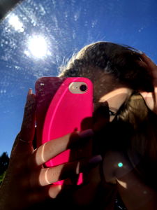 A candid moment of a young woman taking a selfie in sunlight, showing off her pink phone case and red manicure. She is holding her phone out to capture the moment. The image has a warm tone due to the sun glare on the glass.