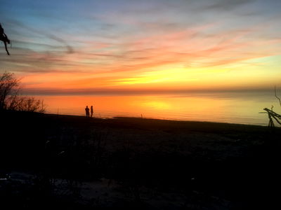 This image captures a serene beach scene during sunset. A lone figure stands on the sandy shore, silhouetted against the warm hues of the setting sun. The ocean stretches out to meet the sky, and a pier extends into the water in the distance.