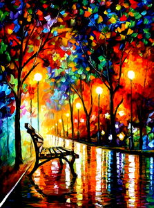 An artistic painting of a person sitting on a bench at night under colorful city lights, rendered in vibrant hues. The scene depicts a romantic urban setting.