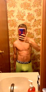 Jordan, an OnlyFans model from Florence, SC is seen in a bathroom mirror. He's shirtless and showing off his physique with confidence. The background features a sink and a wooden cabinet. Share your thoughts on the image!