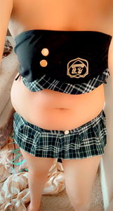 Destiny Love, a popular OnlyFans model, poses confidently in her schoolgirl uniform. This set features a classic plaid skirt, paired with a black bustier and matching black tie. Her outfit is completed with a badge that proudly displays the text 'OnlyFans'. In this image, she seems to be addressing her audience directly, creating an intimate connection with her fans.