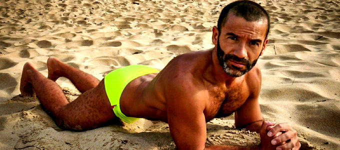 A muscular model posing at the beach, embodying an active and healthy lifestyle.