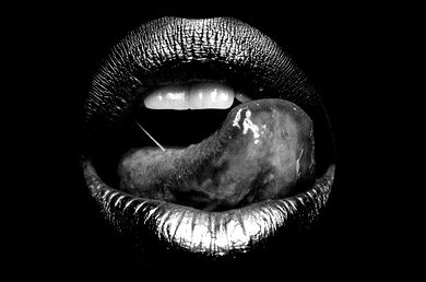 A high-contrast black and white image featuring a model in a body suit with visible stomach muscles, standing against a dark background. The model is looking directly at the camera with a neutral expression.