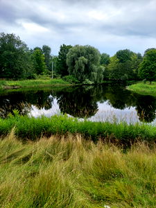 A peaceful scene with a tranquil lake and a park bench overlooking it. Heather stands in the foreground, poised for a leisurely day of reflection.