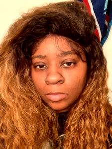 A young African American woman with long curly hair and a thoughtful expression, wearing a white t-shirt.