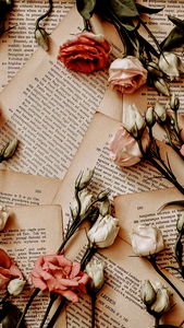 This is an image of a floral bouquet arrangement with white roses, pink roses and greenery. The bouquet is placed on an old book, creating a charming and vintage feel. The background consists of a collection of books, adding depth to the scene.