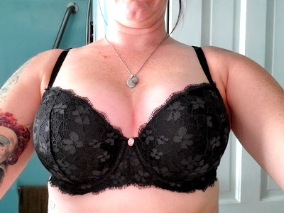 An OnlyFans model showcasing a lacy bra in a strong pose, highlighting the garment's detail and fit.