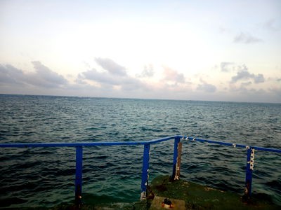 Immerse yourself in the tranquility of this breathtaking ocean scene. This model photo captures a moment of peace and solitude atop a pier overlooking the vast expanse of the deep blue sea. The sky is painted with hues of orange as the sun sets, casting a warm glow on the water's surface. Take a step back and appreciate the natural beauty of this serene landscape.