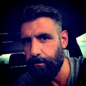 A bearded man with short hair is seen inside a car, showcasing a casual and relaxed vibe. He's dressed in a blue sweater and seems to be in a pleasant mood.