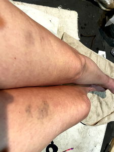 A model wearing athletic attire and flip flops, sitting on a pavement. She has one leg extended and is looking directly at the camera.