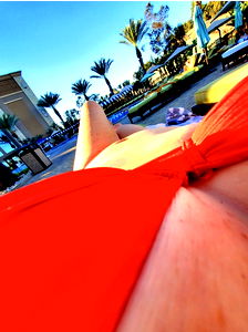 California-based OnlyFans model Nicki posing for a swimsuit photo, exuding confidence with red bikini and blonde hair. Warm ocean backdrop.