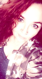 A young woman with striking red hair, visible tattoos, and an expressive gaze. She is dressed casually in a camouflage tank top, and her unique hairstyle adds to her distinctive look. Angielinn appears to be in mid-motion or perhaps posing for a candid shot.