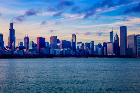 A scenic view of the Chicago skyline with the iconic Willis Tower during sunset. The image captures the essence of urban life in the Midwest, showcasing a picturesque cityscape.