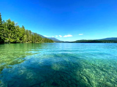 A tranquil image captures the natural beauty of a clear lake, surrounded by lush greenery and mountains, under a sunny sky. The calm blue waters reflect the sky above, creating a peaceful atmosphere for relaxation.