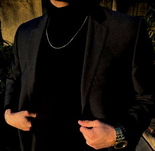 This fashion-forward ensemble features a classic 3-piece suit in navy blue with subtle pinstripes. The jacket is tailored to perfection, providing the perfect balance of style and comfort. Paired with a crisp white shirt and black trousers, this outfit exudes confidence and sophistication. Accessorized with a gold necklace that adds a touch of elegance, it's an ideal choice for smart casual events. Ideal for those who appreciate both fashion and practicality.