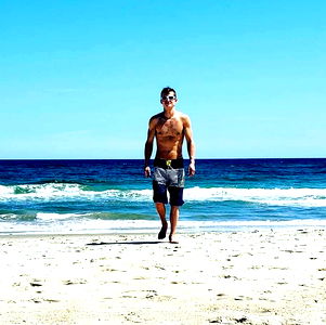 A man with sunglasses is holding a rose, wearing jeans and a tank top. He has tattoos and is standing outdoors under a clear sky. His pose suggests he's ready for a romantic encounter.