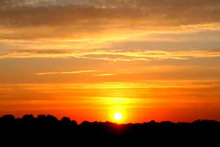An outdoor enthusiast stands triumphantly atop a hill as the sun rises, casting a silhouette against the early morning sky.