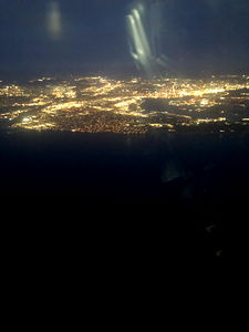 A captivating cityscape at night, viewed from an airplane window. The city lights are in full bloom against the dark sky, creating a beautiful contrast and painting a serene picture. This image captures the essence of urban life at its most dynamic and vibrant.
