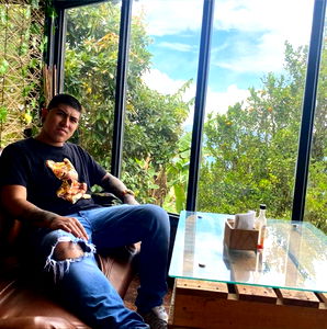 Alejandro Londoรฑo, a model from Baja California, is seen posing in front of the red LAL EXPO signage. He's captured mid-pose with a finger on his hip and one on the wall behind him, exuding a sense of style and confidence. The event appears to be outdoors under clear skies, as suggested by the presence of trees in the background. The vibrant red color of the sign stands out against the natural backdrop. Alejandro's attire is casual yet chic, with a black t-shirt that contrasts with the bright signage. His stance and expression reflect his engagement with the event and its atmosphere. This image captures a moment of Alejandro Londoรฑo in an outdoor setting at LAL EXPO, showcasing his participation and interaction with the event.