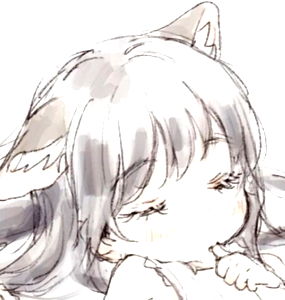 A cute anime-style character with white hair and cat ears, depicted in a tranquil moment of rest.