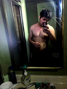 An OnlyFans model in a casual pose, showcasing a tattoo. He is shirtless with a beard and glasses, holding a phone.