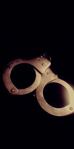 An image of a pair of handcuffs with the word 'freedom' etched on them against the backdrop of a revolver, symbolizing law enforcement or the justice system.