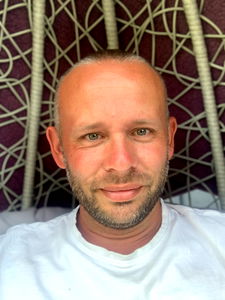 A man with a shaved head and a visible tattoo is sitting comfortably. He's wearing a simple white t-shirt and appears to be enjoying his time outdoors. His gaze is directed towards the camera with a relaxed and content expression.