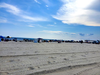 A serene day at the beach with a group of friends enjoying the sun, sand and blue ocean. A perfect setting for relaxation and enjoyment.