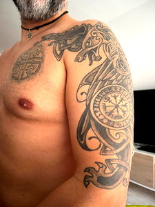 The image shows a man with an intricate tribal tattoo, exhibiting well-defined shoulder muscles. The man appears to be middle-aged or older and is shirtless, providing a clear view of his upper body. His tattoos are elaborate with various designs, which may suggest that he has a fondness for art or personal expression.