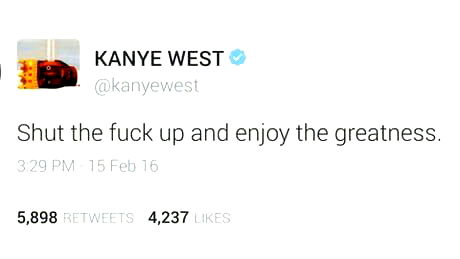 Screenshot of Kanye West's post on Instagram with a caption that reads 'enjoy the greatness', a username handle, and an image featuring a car.